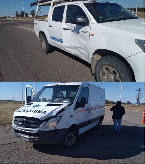 Constituida la prevención en el lugar se constata la veracidad de lo informado tratándose de una ambulancia interno N° 6524, dominio PCL 333 perteneciente (Hospital Salvador Mazza) de Villa Ángela, conducida por ciudadano de 42 años chofer (ileso), y Camioneta marca Toyota modelo Hilux, empresa Secheep, de la localidad de San Bernardo, identificada PK-416 dominio colocado PHO 515, conducida por ciudadano masculino, (ileso).