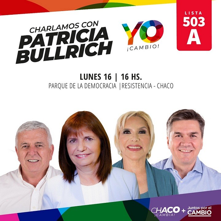 La presidente del PRO a nivel nacional, Patricia Bullrich, visitará la provincia este lunes 16 de agosto: el encuentro será una charla en el Parque de la Democracia con los integrantes de la Lista 503 A -liderada por Zdero y Polini- a partir de las 16 horas.