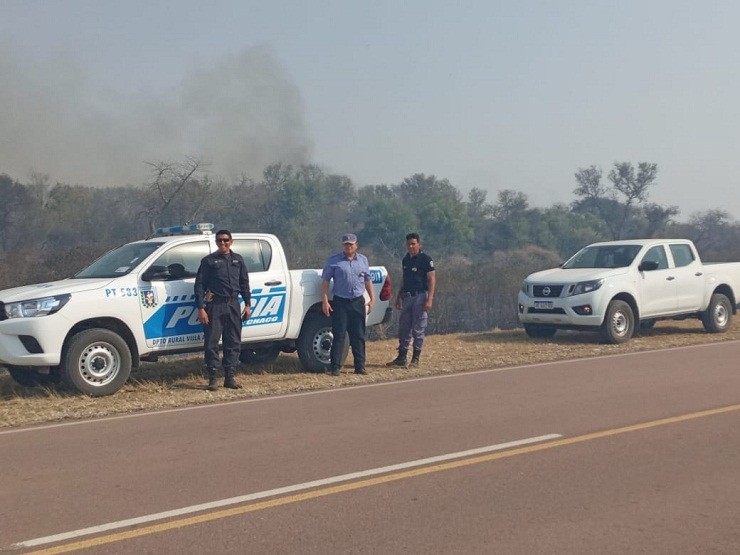 Ante esta situación comisión policial se constituyo en lugar a/c Comisario Inspector, Muñoz José Luís, quien en forma inmediata organizo operativo con Comisaria Segunda, Bomberos Villa Ángela y colaboracion de Bomberos Voluntarios de Coronel Dugraty, a/c Solotarchuk Cesar  previo dar aviso a personal Div. Bomberos, quienes se acercaron al lugar, junto a vecinos, avión cisterna particular o también llamado aeronave, quienes están trabajando en el lugar a fines de apagar foco igneo.