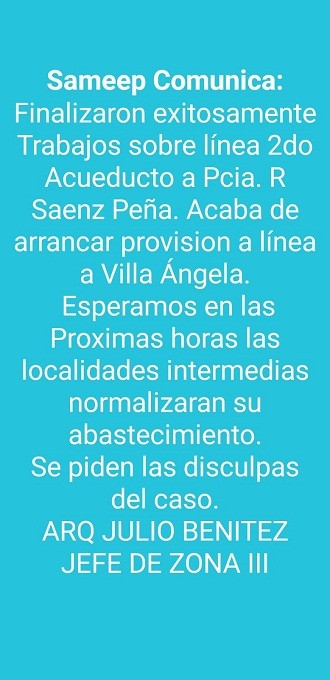 Hace instantes desde la Empresa SAMEEP Villa Ángela, se informó que finalizaron exitosamente los trabajos sobre la línea del Segundo Acueducto a Presidencia Roque Sáenz Peña. Lo que mantenía suspendida la provisión de agua a nuestra ciudad.