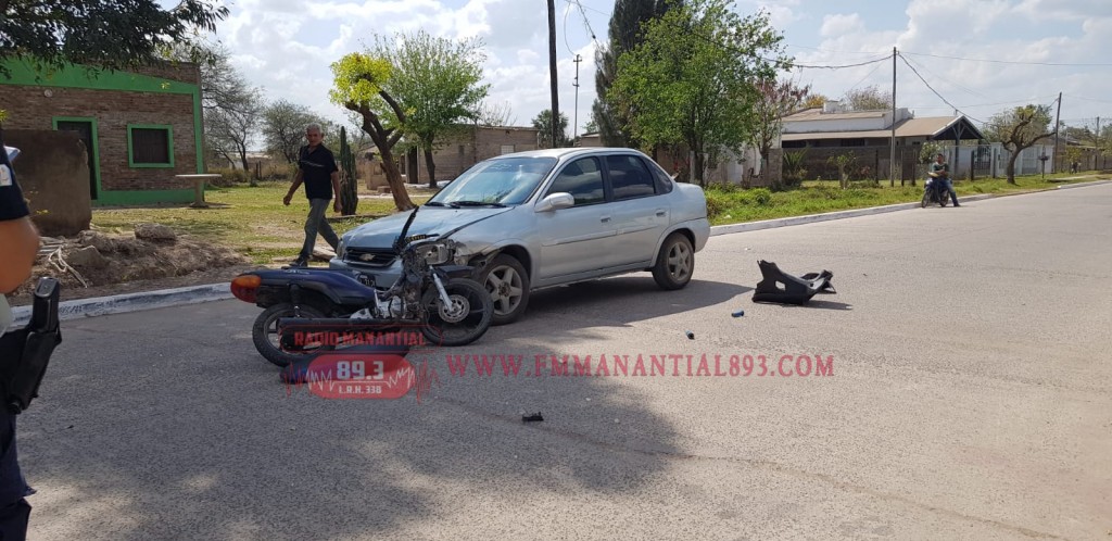 Se constituye en el lugar la prevención policial, constatando el hecho en el que participaron un automóvil Chevrolet Corsa Classic de color Gris, guiado por S. L. R. de 41 años, domiciliado en el lote 20 de la localidad, resultando ileso, y una motocicleta de marca Zanella 110 c.c. de color azul y negra, guiada por N. A. G. de 29 años, domiciliado por calle Tucumán de la ciudad de Villa Ángela, quien resultó con lesiones, siendo trasladado en ambulancia hasta el Hospital Local para su atención médica.