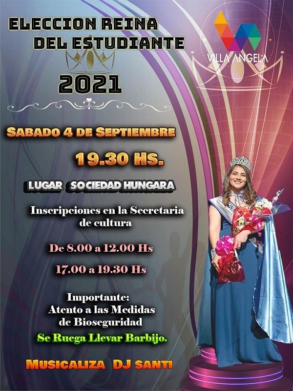 La Secretaría de Cultura, Turismo y Deportes del municipio de Villa Ángela informó sobre la elección de la Reina del Estudiante 2021 que se desarrollará el próximo sábado 4 de septiembre. Asimismo, invitaron a qué las estudiantes interesadas en participar, que estén cursando tercer y cuarto año de secundaria, se acerquen a inscribirse en la Dirección de Cultura ubicada en San Martín y Pasteur.