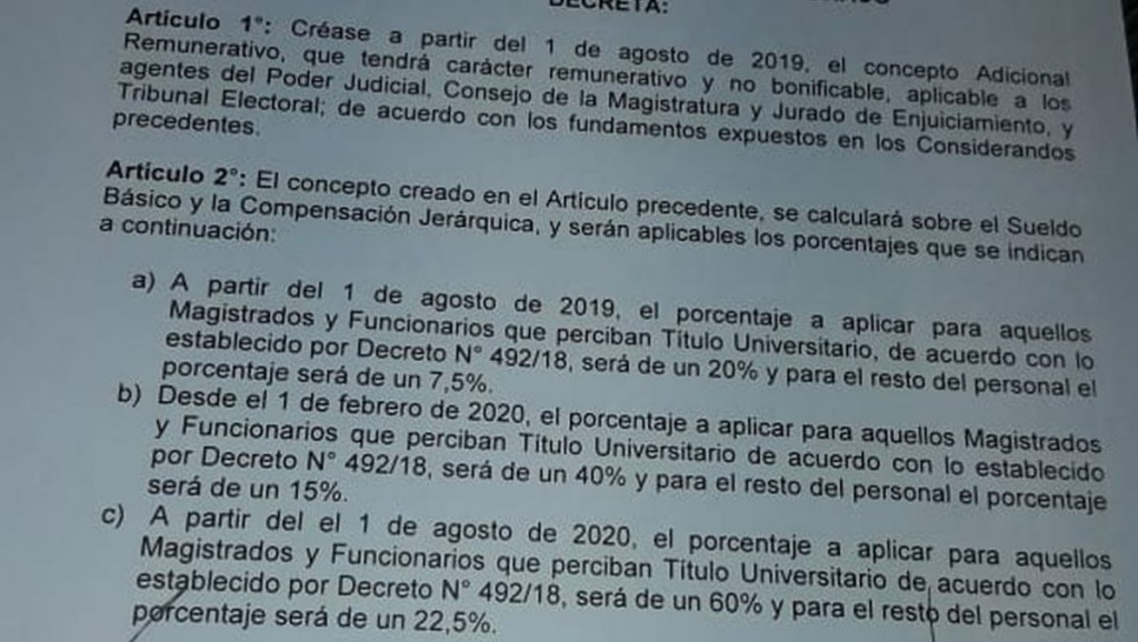 1. A partir del 1 de agosto de 2019, el porcentaje para magistrados y funcionarios que perciben título universitario será de un 20%, y para el resto del personal será de un 7,5%.