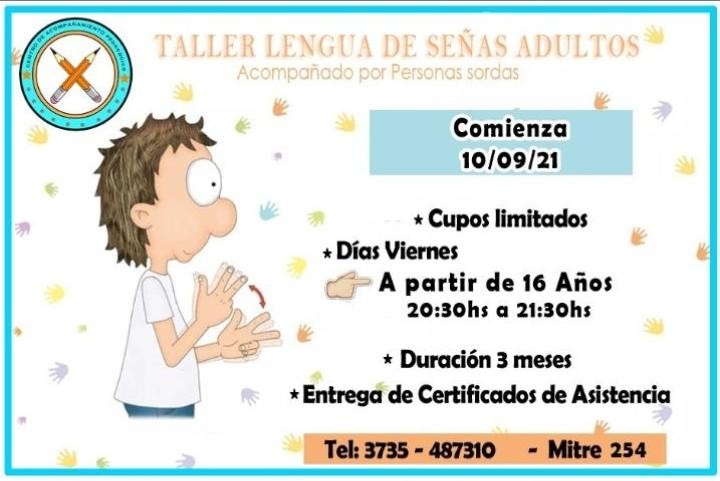 Desde el Centro de Acompañamiento Padagógico, invitan a la comunidad a particpar del Taller de Lengua de Señas, para Niños/as y Adultos,el cual estará acompañado por personas sordas, con cupos limitados. El cual tendrá inicio a partir del proximo viernes 10 de septiembre y tendrá tres meses de duración.