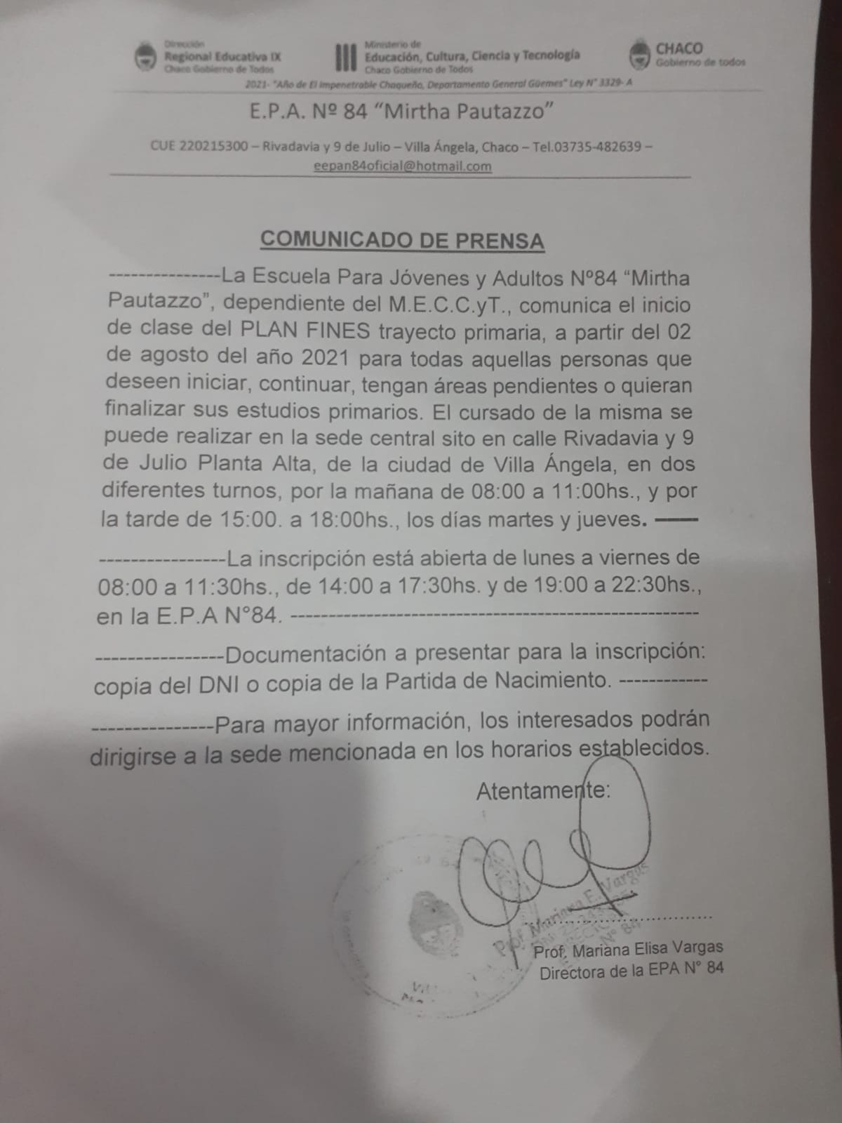 La profesora Mariana Elisa Vargas, directora de la Escuela Para Adultos N°84, mediante comunicación telefónica con #RadioManantial89.3 informó acerca del inicio de clases del Plan Fines. "Es un programa a nivel nacional que le da la posibilidad a las personas jóvenes y adultas a partir de los 14 años para finalizar el ciclo primario con esta modalidad".