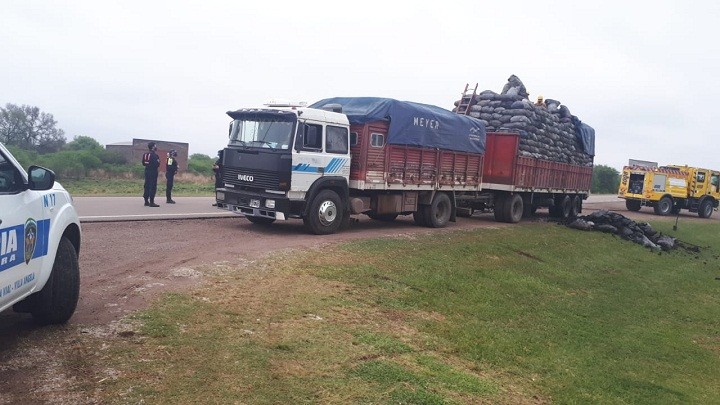 Fuentes policiales informaron que cerca de las 12:45 acudieron para extinguir el incendio de bolsas de carbón vegetal que transportaba un camión Iveco en su remolque.