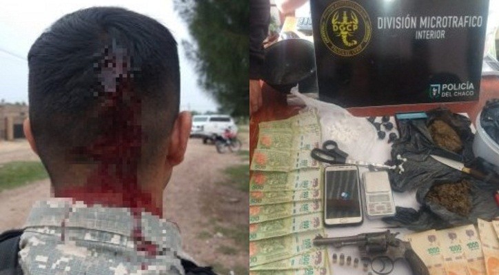 Los oficiales ingresaron al domicilio de un joven de 24 años y en presencia de un testigo, el ayudante de Fiscal ordenó el secuestro de 122 gramos de marihuana disgregada en diferentes formatos, 31,8 gramos de cocaína, dos teléfonos celulares, un revolver calibre 32, 7 proyectiles calibre 32. Además de una balanza de precisión, varios recortes de polietileno, una tijera y más de 15 mil pesos. Cuando se estaba realizando la diligencia judicial, varias personas en aparente disconformidad con la acción de las autoridades policiales, comenzaron a arrojar elementos contra los efectivos del COM, que se encontraban en custodia externa del perímetro. Como consecuencia de esto, uno de los efectivos resultó herido con un corte en su cabeza por lo que fue trasladado al Hospital 4 de Junio. Para finalizar la diligencia, se procedió al traslado del dueño de casa a la unidad donde fue notificado en la causa “Supuesta Infracción a la Ley N° 23737 de estupefacientes en Función Ley N° 2304-N”, de acuerdo a lo dispuesto por la Fiscalía Antidrogas N° 2. Fuente: DCH.