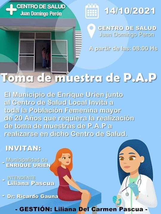 Desde el Municipio de Enrique Urien y el Centro de Salud "Juan Domingo Peron", invitan a todas las mujeres mayores de 20 años, a la Jornada de Toma de muestras de P.A.P.