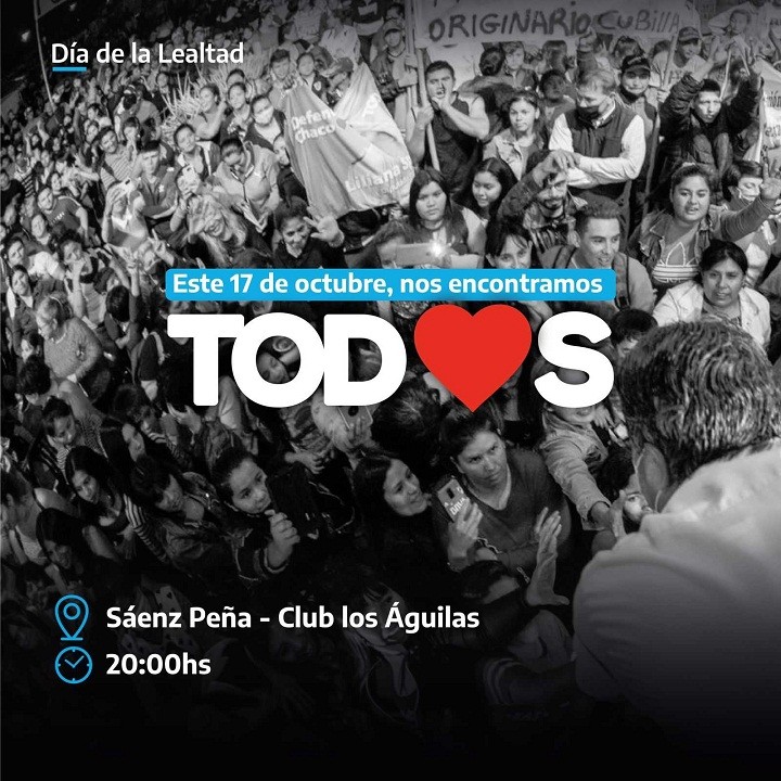 El Frente de Todos Chaco prepara un gran acto para conmemorar este próximo 17 de octubre el Día de la Lealtad Peronista. La propuesta política convocada bajo el lema “Este 17 de octubre, nos encontramos”, se realizará desde las 20 en el club Águilas Rugby Club de Presidencia Roque Sáenz Peña.