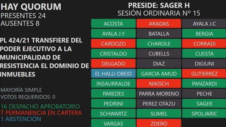 De los 32 diputados totales, 24 marcaron presente y 8 ausente. El proyecto 424/21, que integró el primer tema en la orden del día, obtuvo la aprobación con 16 votos a favor, 7 en contra y 1 abstención a manos del diputado Obeid.