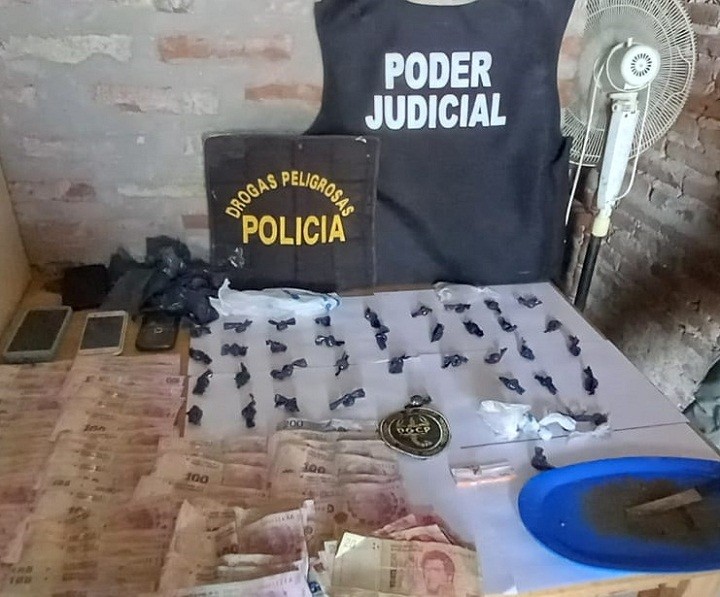 Allí hallaron 39 envoltorios con marihuana, 1 con cocaína, recortes de polietileno, un plato con restos de estupefacientes, papelillos, $14.240 pesos, cuatro celulares y una balanza electrónica. Todos los elementos fueron secuestrados.