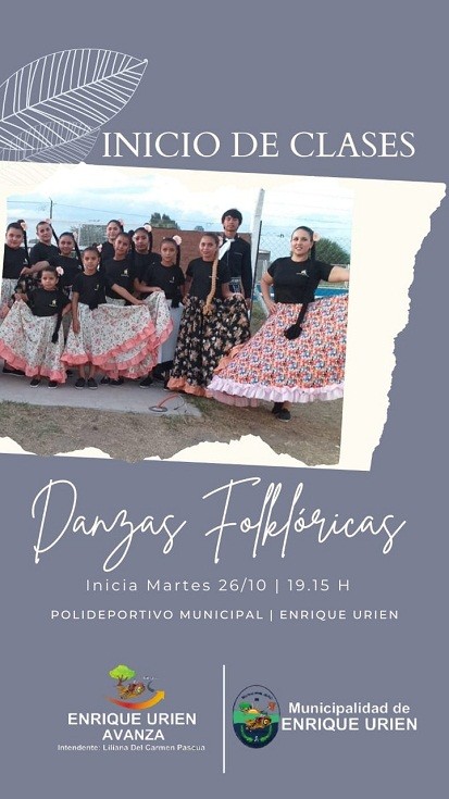 La Prof. Yamila Gallardo, invita a la comunidad de Enrique Urien, interesada en participar de la Escuela de Danzas Folklóricas "Raíces de Mi Pueblo", a las clases que darán inicio este martes 26 de octubre a las 19:15 horas, en el Polideportivo de la localidad.