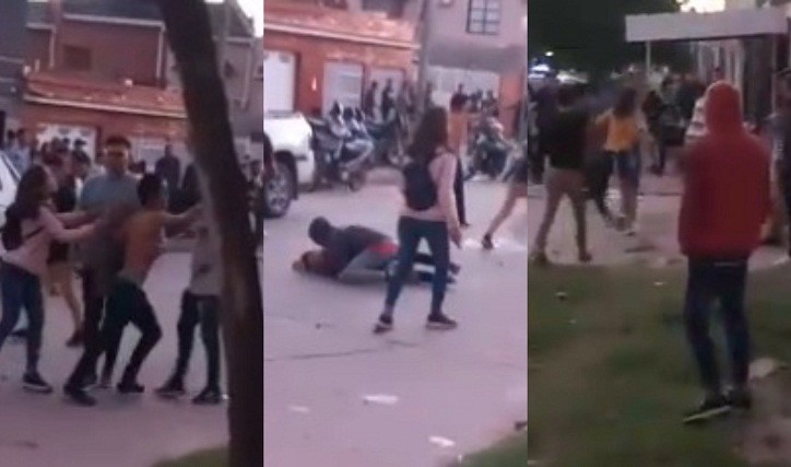 En las duras imágenes se puede observar cómo, a plena luz del día, varios grupos de jóvenes afuera del boliche estaban empujándose, peleándose y algunos tirando proyectiles.