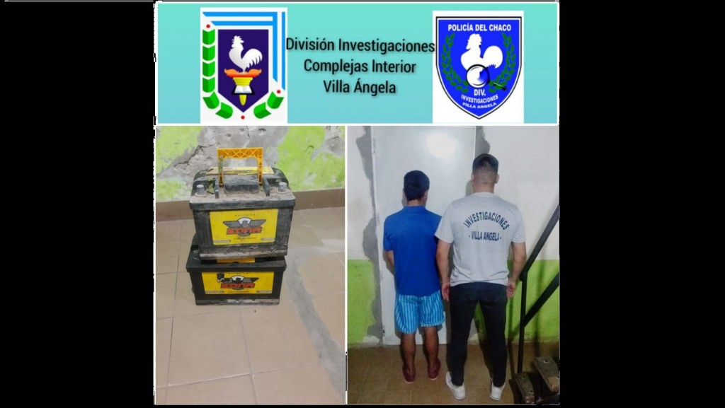 En la causa, la División de Investigaciones Complejas Interior Villa Ángela, tomó conocimiento de que un tal TIKI y TYSON L. se hallarían ofertando para la venta, elementos de dudosa procedencia, logrando en horas de esta mañana, el secuestro de 2 baterías de 12x75 para auto marca EDNA, modelo PREMIUM-CALCIO PLATA, ambas de color negro y stickers amarillos, en regular estado de uso y conservación, procediendo a incautarse bajo actas respectivas y donde posteriormente se logró la conducción de E. E. L. de 18 años, que conforme a la orden del fiscal fue notificado de su aprehensión a disposición de la fiscalía actuante.