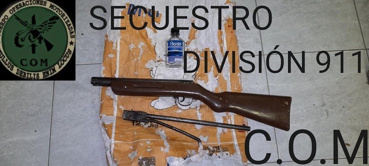 El día sábado a las 21.20 hs el personal de la sección C.O.M., proceden a demorar a una persona de sexo masculino de 37 años, quien a bordo de una motocicleta Gilera Smash de 110 cc., llevaba un rifle Aire Comprimido adaptado con tubo cañón calibre 22 y una vaina servida del mismo calibre.