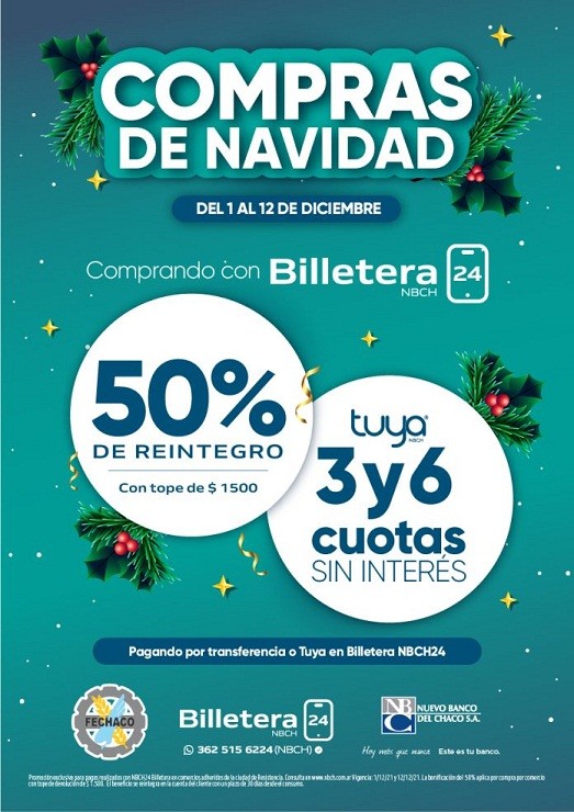 La promo Pre Navidad comenzará el miércoles 1 y se extenderá hasta el domingo 12 de diciembre para comprar con QR en Billetera NBCH 24 en comercios adheridos de toda la provincia, obteniendo un reintegro del 50% de importe del valor de la compra que se podrá financiar en hasta 6 cuotas u operar con saldo de cuenta.