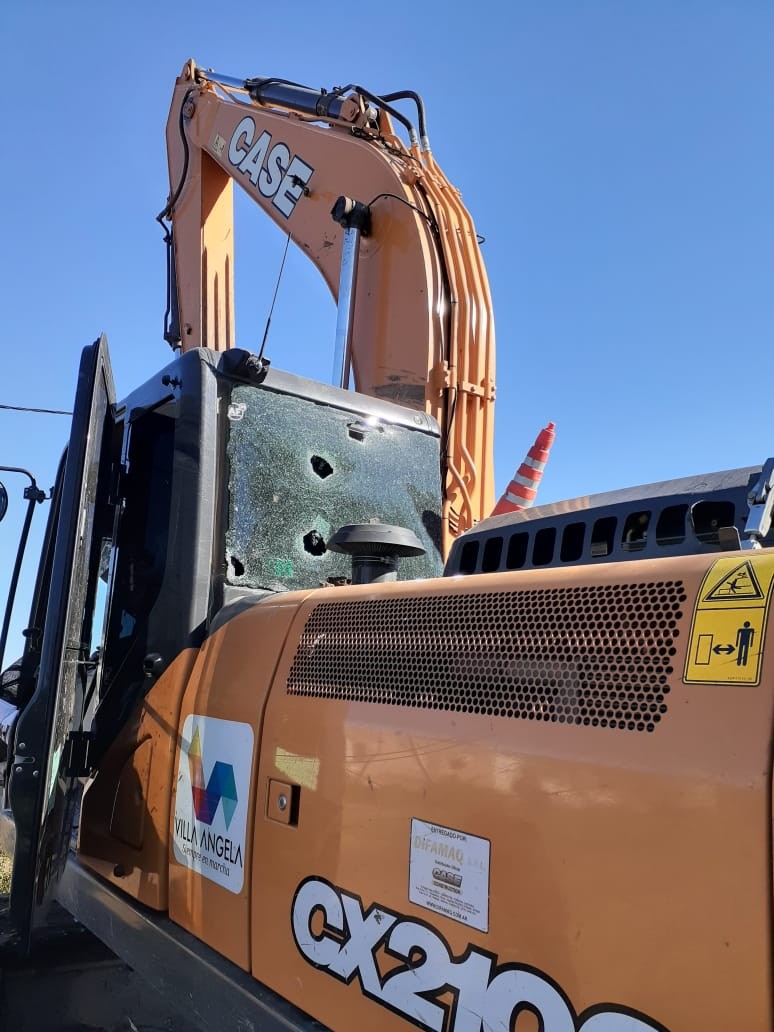 Se entrevistaron con un ciudadano de 30 años, domiciliado en esta ciudad quien manifestó en momentos antes que un grupo de cuatro personas intentó agredirlo y uno de estos vestido de campera color azul y gorra tenía un cuchillo en su mano que le exigía que le entregase su celular y su billetera por lo que de inmediato subió a la máquina excavadora perteneciente al municipio con la que se encontraba trabajando, y se encerró allí para resguardar su integridad física pero estos masculinos comenzaron a lanzar piedras hacia la maquina provocando ruptura de ventanillas,  al ver móvil policial huyen del lugar.