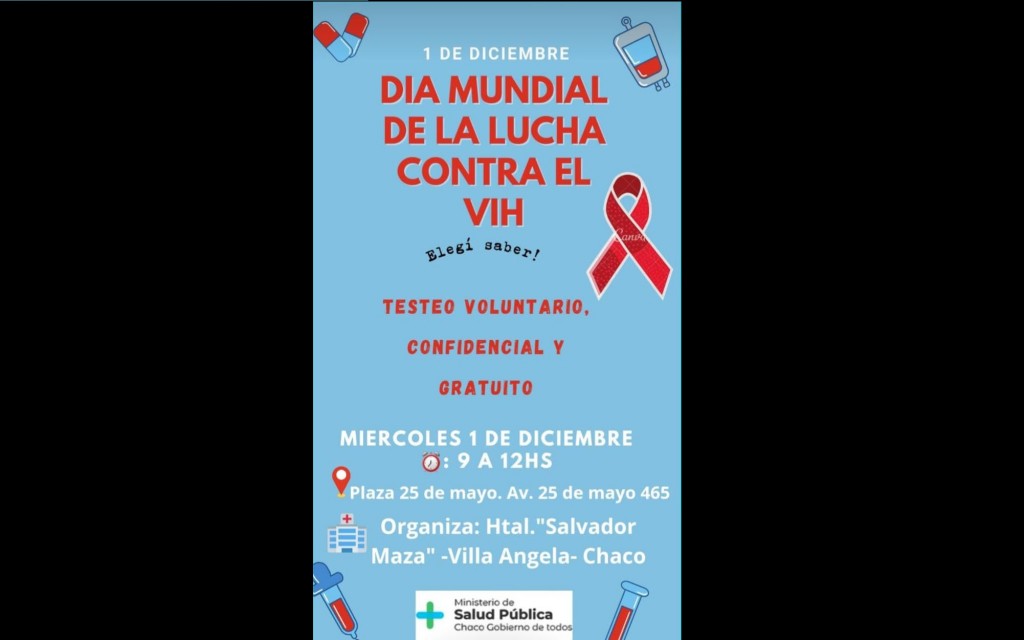 En la mañana del día miércoles 1 de diciembre, al conmemorarse el Día de la Concientización de la Lucha contra el VIH, el Hospital Salvador Mazza, realizará testeos voluntarios, confidenciales y gratuitos, bajo el lema “ELEGÍ SABER”, en la plaza central de la ciudad de Villa Ángela.