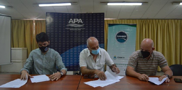 Autoridades de la Administración Provincial del Agua (APA) y la empresa prestataria Sameep firmaron un convenio de colaboración para capacitaciones en manejo de técnicas analíticas para efluentes cloacales. La iniciativa permitirá que especialistas del laboratorio de APA brinden información al personal técnico de Sameep para que puedan realizar controles y análisis de muestras en la Planta de tratamiento de líquidos cloacales del Gran Resistencia.