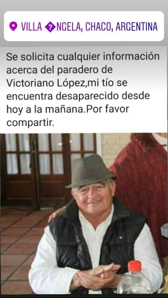 El día de hoy tras averiguaciones, el personal de la Division Investigaciones trabajando en conjunto con personal de Comisaría Primera logramos la localización y paradero del ciudadano LOPEZ, quien fue hallado junto a los ciudadanos W. D. G de 25 años y J. A. L. ALIAS BOLIVIANO de 49 años de edad a bordo automóvil marca FIAT, mod./UNO FIRE, color blanco; ambos ciudadanos manifestaron haber estado cazando en zona atrás de “La 30” Provincia de Santa Fe, donde quedaron empantanados lo que demoro su regreso.