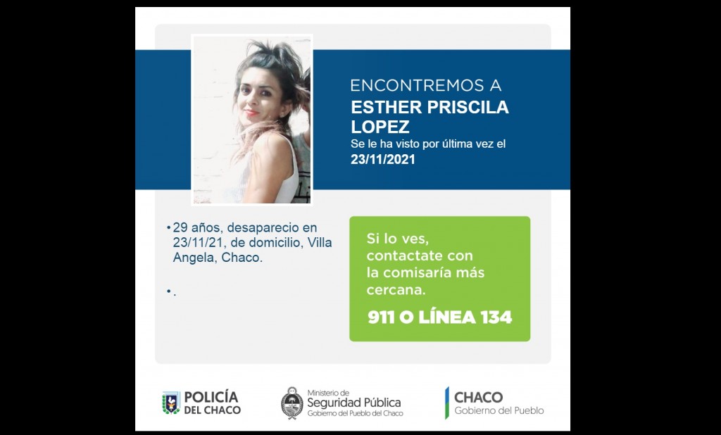 La Policía del Chaco en base a una denuncia registrada en Comisaria Segunda Villa Angela, solicita a la comunidad su valiosa colaboración de informar a la unidad policial más cercana cualquier información relacionada al paradero de ESTHER PRISCILA LOPEZ, de 29 años, de 1,60 metros de altura, de contextura física delgada, tez blanca, cabello semi largo negro y puntas rubio, ojos color cafe Se le ha visto por última vez en Domicilio en fecha 23/11/2021.