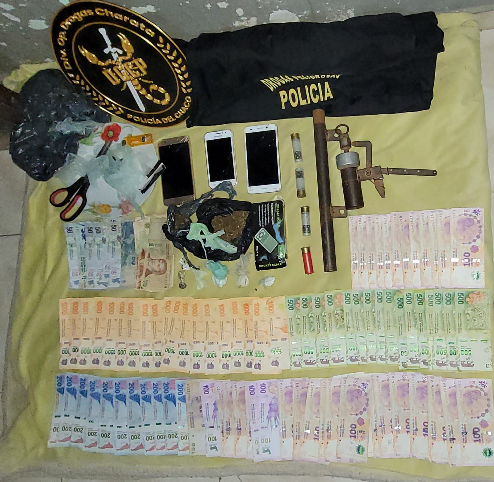Una vez que ingresaron a estas casas, se pudo proceder al secuestro de 5 envoltorios de coca�na que dieron un peso de 21,9 gramos, 5 "bochitas" de marihuana con la cantidad total de 41, 2 gramos, dinero en efectivo por la suma de $37.730, una balanza de precisi�n, 3 celulares, y un arma de fuego de fabricaci�n casera conocida como ?tumbera?, junto con 4 cartuchos calibre 16.