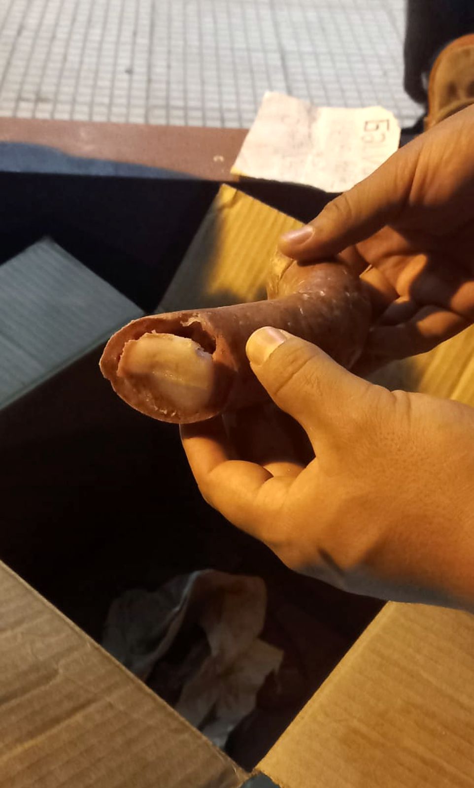 Luego de identificarla, siendo una mujer de 40 años domiciliada en Barrio Itatí de esa ciudad, se le inspecciona el contenido de la caja, en presencia de testigo hábil, detectando una bolsa con tres trozos de Chacinados los cuales, al ser minuciosamente controlados se observa en el interior de uno de ellos, un envoltorio tipo “bochita”, con una sustancia blanquecina la cual, al ser sometida a prueba de campo con reactivos químicos, resultaría ser Cocaína, con un peso de 0,9 gramos.