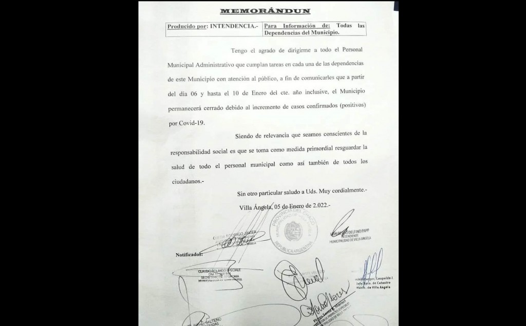 El MUNICIPIO de la ciudad de Villa Ángela permanecerá CERRADO desde este jueves 06 hasta el lunes 10 de enero 2022 inclusive debido al incremento de casos confirmados (positivos) por Covid-19.