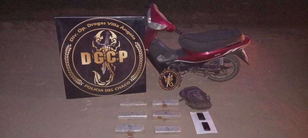 A raíz de ello, se solicita la inmediata colaboración de la División de Operaciones Drogas Interior Charata, estableciéndose controles en los accesos de la ciudad, haciendo uso de la totalidad de los recursos humanos y materiales de ambas unidades, logrando a horas 19:15, interceptar a dos masculinos a bordo de una motocicleta portando una mochila, la cual a simple vista se observó varios formatos rectangulares con sustancia vegetal verde amarronada.