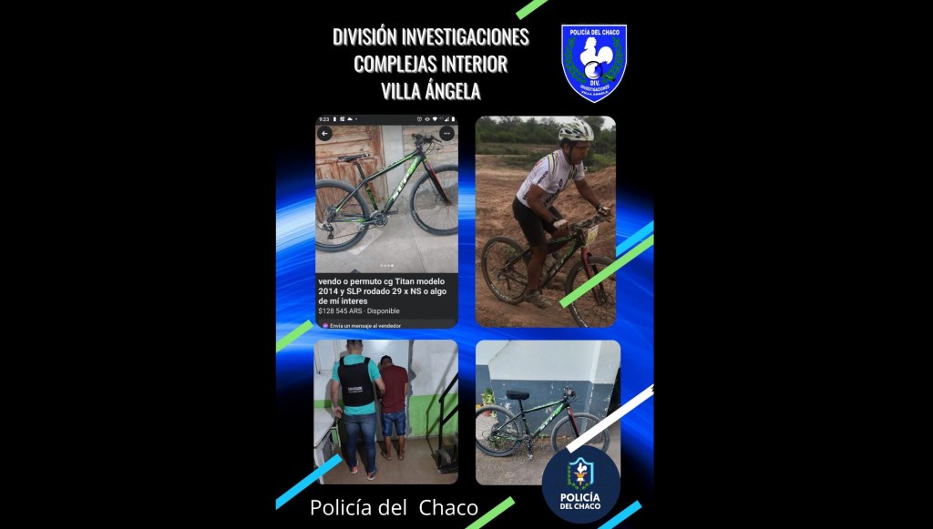 A. A. D. de 45 años de la ciudad de Charata, denunció en la División de Investigaciones Complejas Interior Villa Ángela, que en fecha 10 de noviembre del 2021, en horas de la siesta, personas desconocidas ingresaron a su domicilio por un portón que había quedado sin medidas de seguridad, y sustrajeron una bicicleta marca SLP modelo Pro50, de aluminio, de color negro y verde, la cual fue modificada para competición, tiene manubrio marca VENZO, horquilla de carbono de color negro con rojo, asiento marca VENZO, caja pedalera hueca marca SHIMANO modelo DEORE, piñón corrido, de ocho coronas marca SHIMANO, masa en cada rueda de rodamiento marca SHUNFEN, con frenos hidráulicos, con cubiertas MAXIS y delantera CHAOYAN, que por comentarios de conocidos tomó conocimiento de que el rodado se hallaría en la ciudad de Villa Ángela.