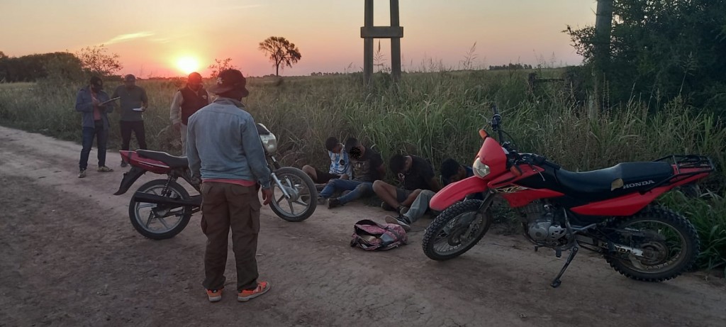 Se identificó a los masculinos que se conducían en una moto marca Honda, siendo H. y D. en tanto M. e Y. andaban en el rodado de marca Gilera, quienes fueron sorprendidos por la prevención, donde intentan darse a la fuga y haciendo uso de la fuerza en la medida de la necesidad, se logró la reducción de las cuatro personas, destacando que, a modo disuasivo, se efectuaron disparos de escopeta con cartuchos AT, hacia el suelo con dirección a la maleza.