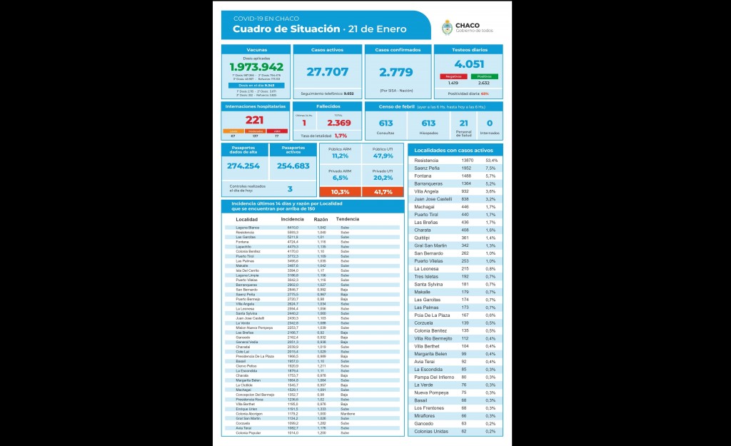 El gobierno provincial dio a conocer esta noche un nuevo cuadro de situación epidemiológica en el marco de la pandemia por COVID-19. En el informe elaborado este viernes 21 de enero, los testeos diarios realizados son 4.051 (1.419 negativos y 2.632 positivos) con un porcentaje de positividad diaria del 65 por ciento.