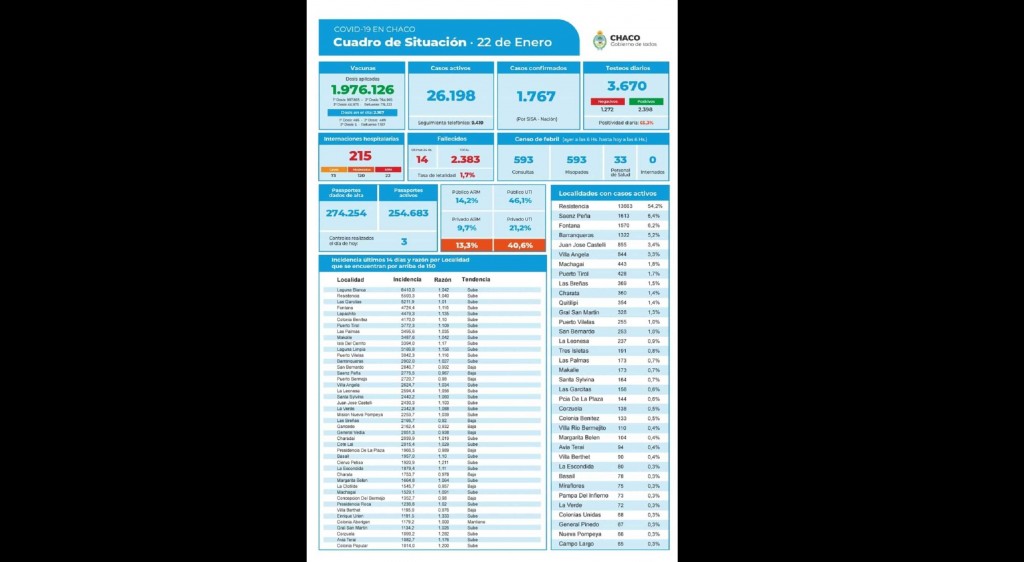 La tasa de letalidad es del 1,7 por ciento con 14 fallecimientos reportados en las últimas 24 horas. Por otro lado, hay 26.198 personas cursando actualmente la enfermedad (9.410 de ellas con seguimiento médico telefónico). La ciudad de Resistencia presenta el mayor número de activos, con 13.663 al día de la fecha, lo que representa un 54,2 por ciento en toda la provincia.