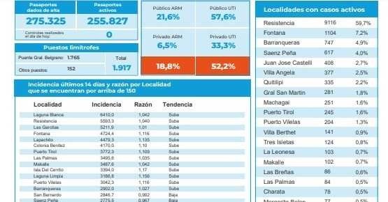 Por otro lado, hay 15.652 personas cursando actualmente la enfermedad (11.9937 de ellas con seguimiento médico telefónico). La ciudad de Resistencia presenta el mayor número de activos, con 9116 al día de la fecha, lo que representa un 59,7 por ciento en toda la provincia.