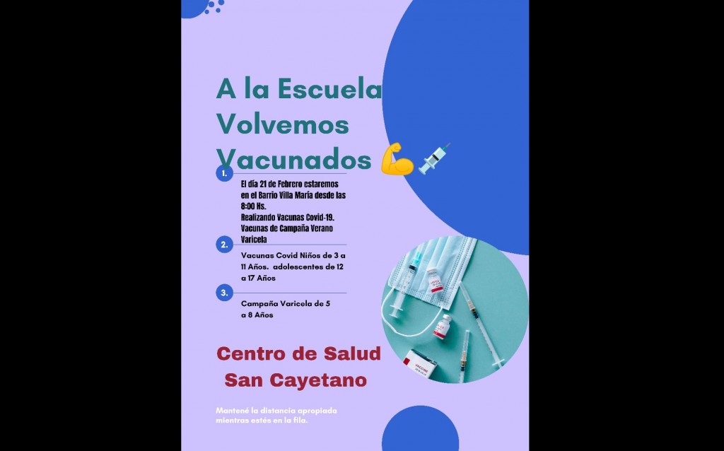 El Centro de Salud de la ciudad de Villa Angela "San Cayetano" lanzó su plan de vacunacion con un eslogan bien claro en cuanto a la prioridad de este nuevo retorno a las aulas:"a la escuela vovemos vacunados". Se trata de 3 días a partir del 21 de febrero en los cuales el centro visitará algunos barrios de la localidad con el objetivo de inocular a los niños de entre 3 y 11 años y adolescentes de 12 a 17 años, a si mismo se intentará cumplir con la campáña en contra de la varicela, por lo tanto también habra vacuna contra dicha enfermedad para menores de entre 5 y 8 años de edad.