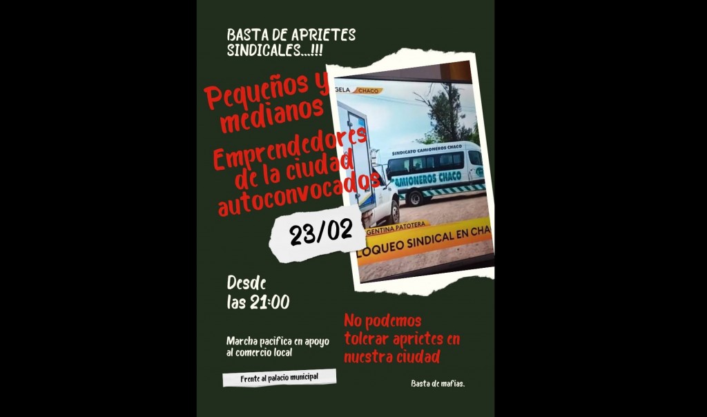 En este sentido, Milton “Luchi” Amado, invitó a toda la gente a convocarse esta noche a las 21 hs. en la plaza central de la ciudad de Villa Ángela, a la manifestación pacífica que los emprendedores, medianos y pequeños comerciantes realizan en protestas de las medidas tomadas por el Gremio de Camioneros y sobre todo en apoyo a Elbio Martin dueño de la empresa Distribuidora Martin.