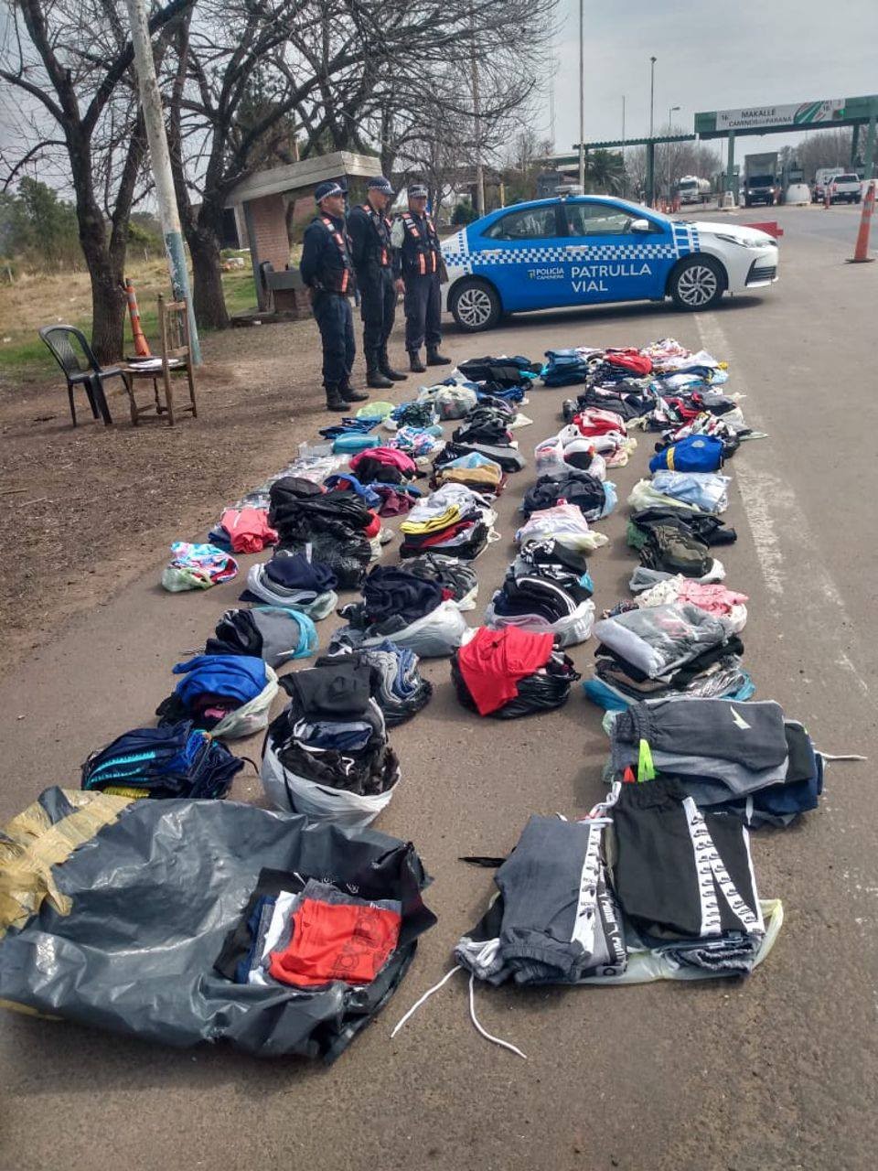 Al inspeccionar minuciosamente los bultos se constata que también transportaban 74 buzos y 70 jeans para niños, 95 gorras, 125 pantalones buzos unisex, 7 camperas simil cuero, 12 shorts deportivos, 17 camisetas de futbol, 209 remeras, 56 gafas de sol, y 39 prendas varias para dama.