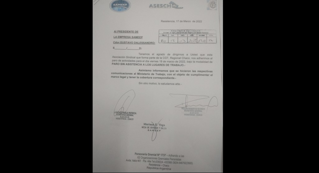 La misiva va dirigida y comunicada al Presidente de la Empresa SAMEEP firmada por Patricia S�nchez, Secretaria Gremial de ASESCH y Roberto Ram�n Rol�n, secretario Gremial de ASESCH.