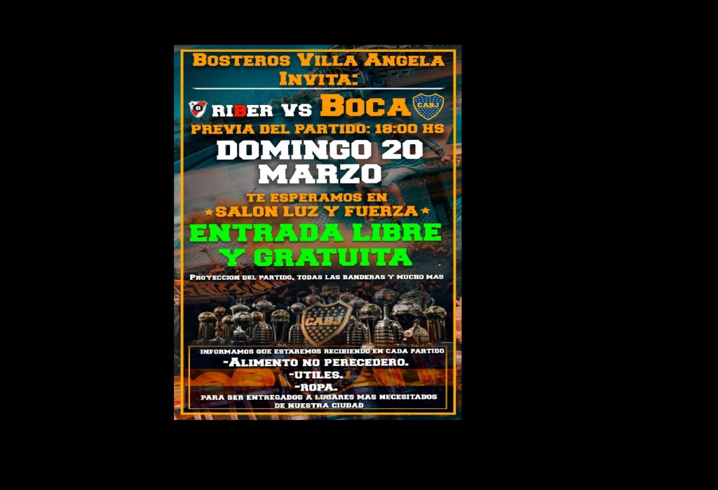 Este domingo desde las 19 se enfrentan el Monumental: River Plate versus Boca Juniors, por la fecha 7 de la Copa de La Liga Profesional. Y en la ciudad, en el salón Luz y Fuerza, la agrupación de Bosteros de Villa Ángela , organizó a partir de las 18 la transmisión en pantalla gigante de la previa y posteriormente, el encuentro, con entrada libre y gratuita. Y la iniciativa de donar alimentos, útiles o ropa para juntar y repartir a los más necesitados.