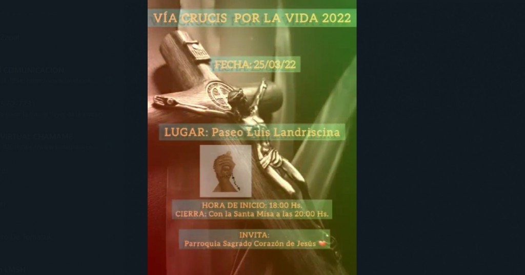 La Parroquia Sagrado Corazón de Jesús invita a toda la comunidad a participar en familia al Vía Crucis, a los que a su vez animan a que lleven en la medida de lo posible remeras blancas, pañuelos y globos celestes, etc., como así también carteles a favor de la vida.