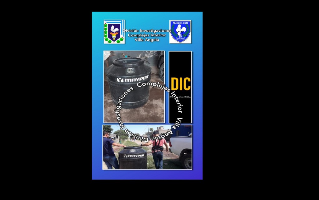 El sábado pasado, un hombre denunció ante la Comisaría Primera, que en su finca de calle 1ra Junta, de la ciudad de Villa Ángela, le faltaba su tanque de 500 litros, marca Mayper y una hoja de su portón delantero.