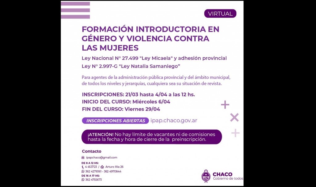 La capacitación y la inscripción es online, las y los trabajadores tienen tiempo de inscribirse hasta el lunes 4 de abril en la página del Instituto Provincial de la Administración Pública (IPAP) http://ipap.chaco.gov.ar/. La formación, que comienza el 6 y finaliza el 29 de abril, da cumplimiento a la Ley Micaela y su adhesión provincial Ley Natalia Samaniego.