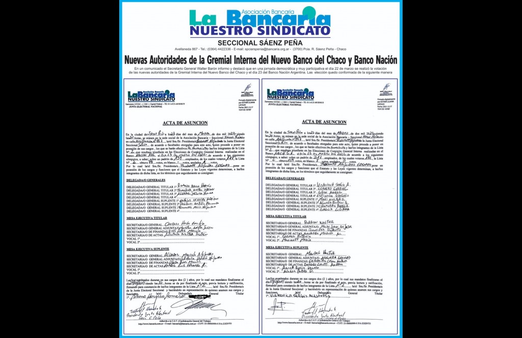 En un comunicado, el Secretario Walter Barón, informó y destacó que en una jornada democrática y muy participativa el día 22 de marzo, se realizó la votación de las nuevas autoridades de la Gremial Interna del Nuevo Banco del Chaco, y el día 23 del Banco Nación, Argentina.