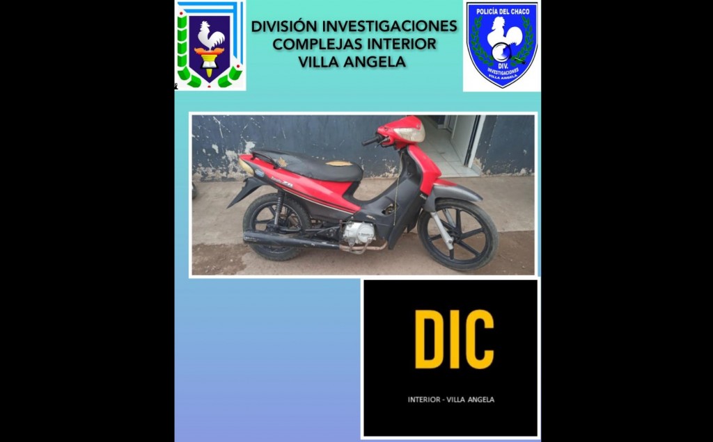 El personal de la División de Investigaciones Interior Villa Ángela, luego de trabajos investigativos relacionados con la Denuncia de C. C. G. de 32 años, que comunicó en Comisaría Segunda de la Ciudad de Villa Ángela, la sustracción de su motocicleta Zanella modelo ZB 110 c.c. de color roja y negra, con el título y cédula de la misma debajo del asiento, logran establecer la ubicación del rodado en Coronel Du Graty, luego de que el personal hizo contacto con el vendedor, quien le pasó la fotografía del título y cédula a nombre de la madre de la denunciante.