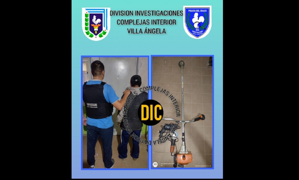 División de Investigaciones Complejas de la ciudad de Villa Ángela logró dar con el supuesto autor de un robo llevado a cabo en el mes de marzo, donde el Damnificado “C.I”, domiciliado por Ruta 95, había denunciado que dejó en su campo, a cargo del detenido, y cuando volvió, no se encontraba el encargado ni su moto Honda Wave, dos motoguadañas y varias herramientas de construcción.