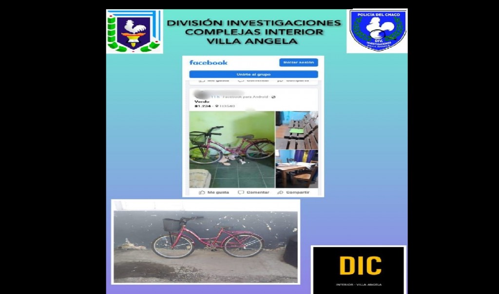 Personal de Investigaciones en el día de hoy, recuperó una bici que había sido robada y denunciada a principios de mes en una finca de la ciudad de Villa Ángela. La misma fue encontrada en una oferta de Facebook. Al llegar al comprador y darle a conocer las condiciones del rodado, el mismo llevó a cabo la entrega voluntaria del vehículo sustraído.