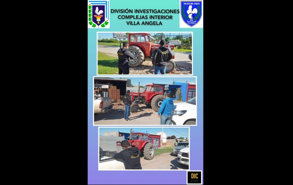 En fecha 19 de Abril, la División de Investigaciones de Villa Ángela, coordinó el intercambió información con la División de Investigaciones de Charata, con la coordinación y lineamientos del Jefe de Departamento de Investigaciones Interior, el Comisario Gustavo Vázquez, en la causa iniciada por la denuncia en la localidad de charata, solicitando el secuestro de un tractor, marca MASSEY FERGUSON, donde tomaron conocimiento de que el tractor se hallaría en el domicilio de un ciudadano de apellido B., y que, este a su vez, estaría ofertando el mismo por la red social Facebook, en una página de Compra y Venta.