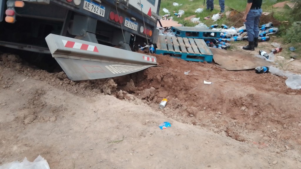 Esta tarde un camión distribuidor tuvo un accidente y estuvo cerca de volcar. Si bien eso fue evitado, si perdió varios productos que trasladaba, en especial packs de gaseosas.