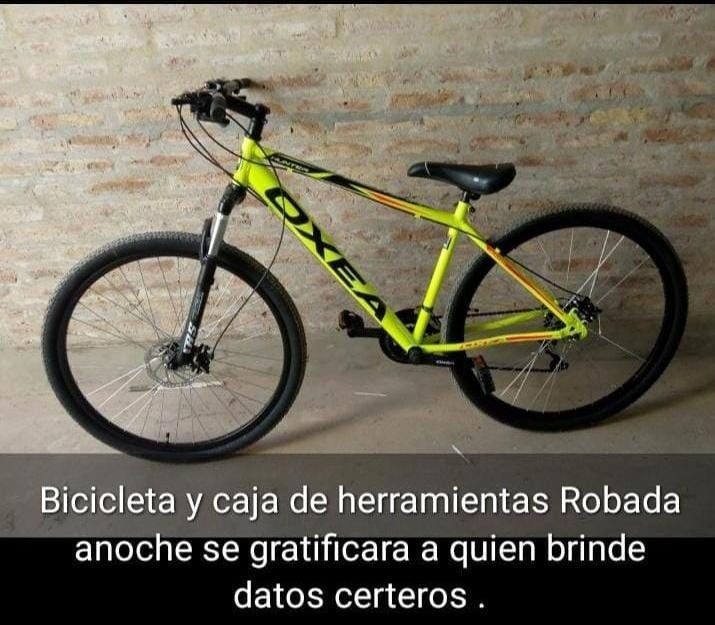 El domingo 1 de mayo, A. R. D. de 37 años, denunció que el día sábado 30 de abril entre horas 22:00 y 01:00 desconocidos, sin ejercer violencia, ingresaron a un quincho ubicado en la parte posterior de su terreno y le sustrajeron sin ejercer violencia, una bicicleta marca OXEA rodado N°29 de color verde flúor, una caja de plástico marca Stanley de color negra y amarilla con herramientas varias de trabajo y una pelota marca Penalty de color azul de cuero plastificada.