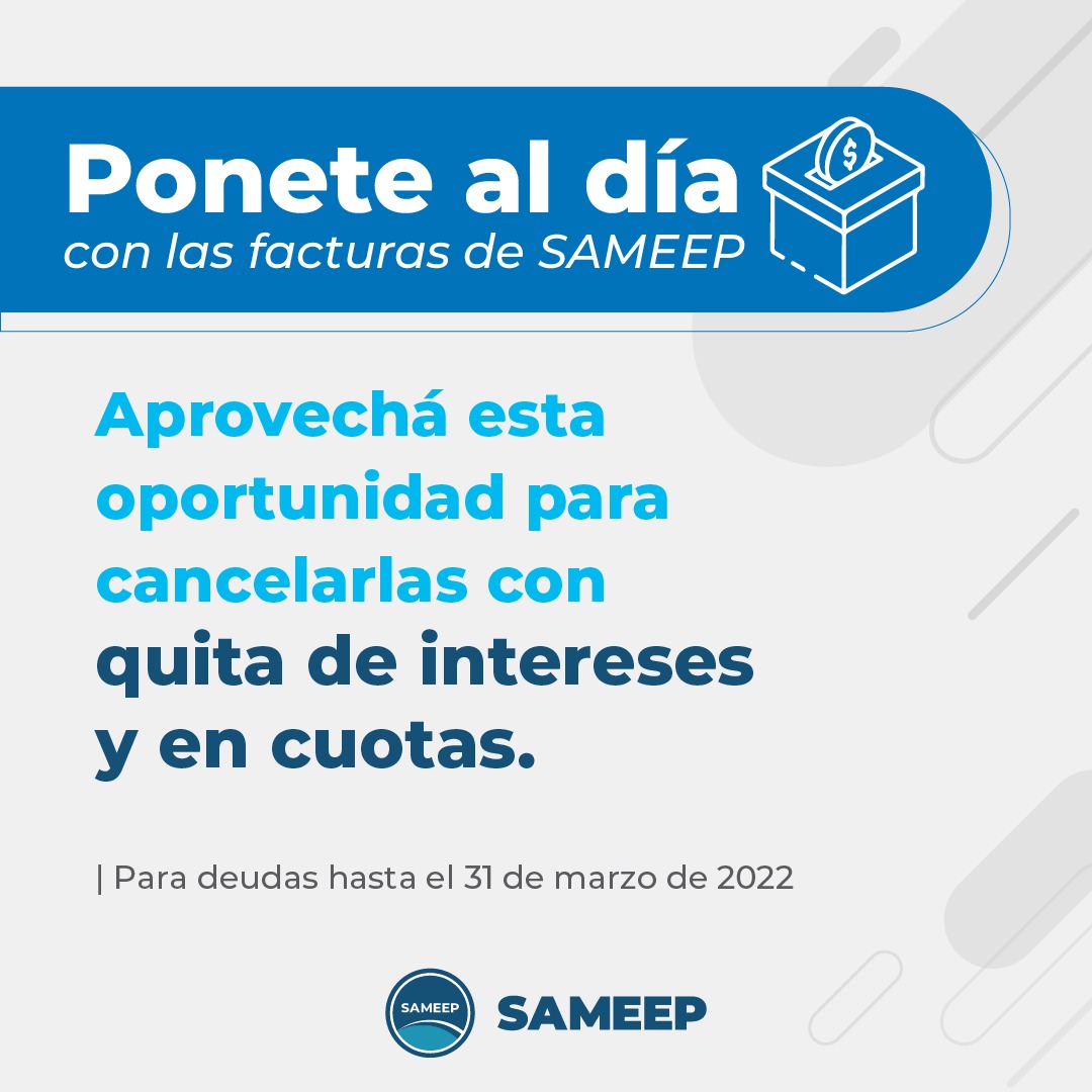 Para conocer el estado de cuenta y facturas adeudadas pueden acceder al Sitio Web de SAMEEP, y/o acercase a las oficinas por la mañana o por la tarde.